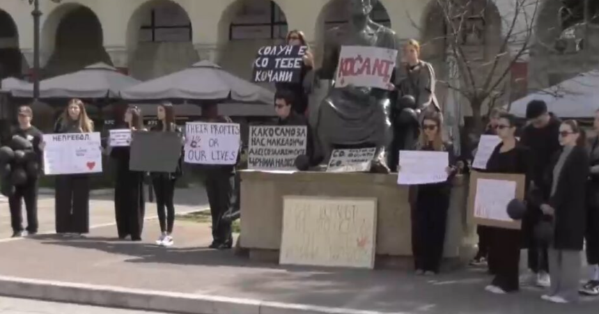 Тие излегоа на плоштадот „Аристотел“ носејќи транспаренти на кои пишуваше „Солун е со тебе Кочани“; „Нивните профити или нашите животи“; „Едни иселивте, а тие што останаа ги убивте – Кочани 16.03.2025“; „Репертоарот е со години ист, настапува корупција, а народот е публика“; „Осамна пролетно утро сончево, а сончевите зраци денес темни црнила“.